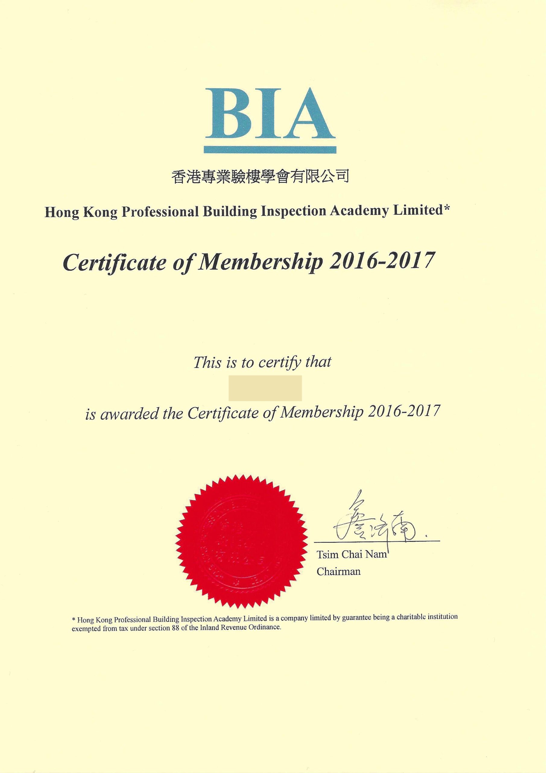 香港專業(yè)驗樓學會會員證書 Certificate of Membership – Hong Kong Professional Building Inspection Academy Limited